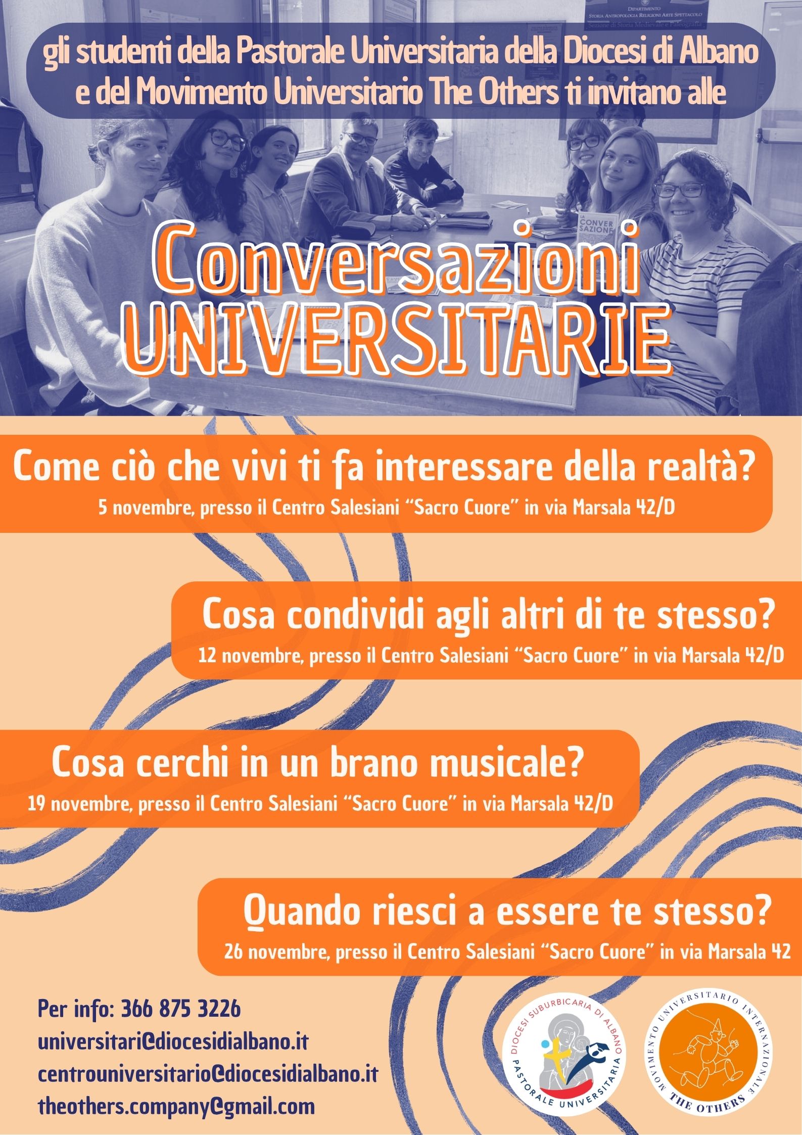 09/11/2025 – Sono riprese, nel mese di novembre, le “Conversazioni universitarie”, incontri settimanali che prevedono un dialogo su un tema specifico d’interesse studentesco e universitario, a cura dell’ufficio per la Pastorale universitaria della diocesi di Albano, diretto da don Nicola Riva, del Centro universitario diocesano “Giovanni Riva” e del movimento universitario internazionale “The Others”.