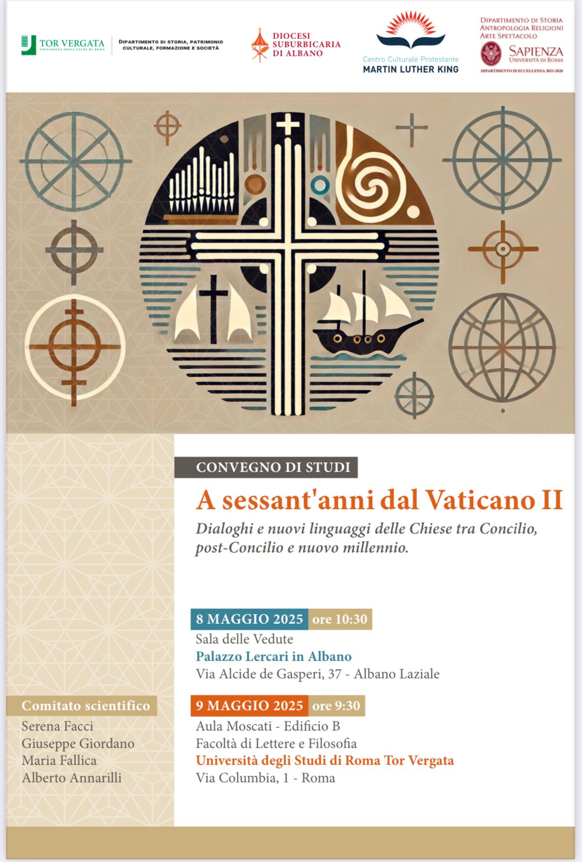 08/05/2025 – Si terrà giovedì 8 e venerdì 9 maggio, tra il Museo diocesano di Albano e la Facoltà di Lettere e Filosofia dell’Università degli Studi di Roma Tor Vergata, il convegno di studi “A sessant’anni dal Vaticano II. Dialoghi e nuovi linguaggi delle Chiese tra Concilio, post-Concilio e nuovo millennio”, a cura di un comitato scientifico composto da Serena Facci, Giuseppe Giordano, Maria Fallica e Alberto Annarilli.