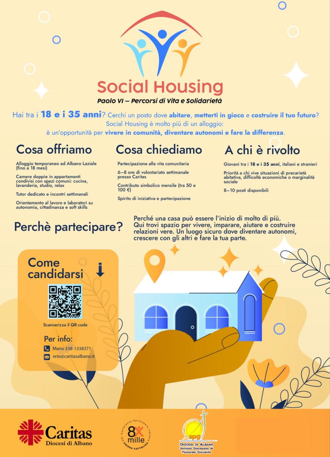 27/08/2025 – Ha preso il via, a cura della Caritas diocesana in collaborazione con il Servizio di Pastorale giovanile della diocesi di Albano, un nuovo progetto di Social housing rivolto a giovani dai 18 ai 35 anni. Nel dettaglio, si offre la possibilità di un alloggio condiviso temporaneo (massimo 18 mesi) ad Albano laziale, per poter vivere un’esperienza di vita in comunità potendo usufruire di percorsi di orientamento al lavoro e laboratori su autonomia, cittadinanza e soft skill, in cambio della partecipazione alla vita comunitaria, un servizio di 6-8 ore di volontariato settimanale presso la Caritas e un contributo simbolico mensile (tra 50 e 100 euro).