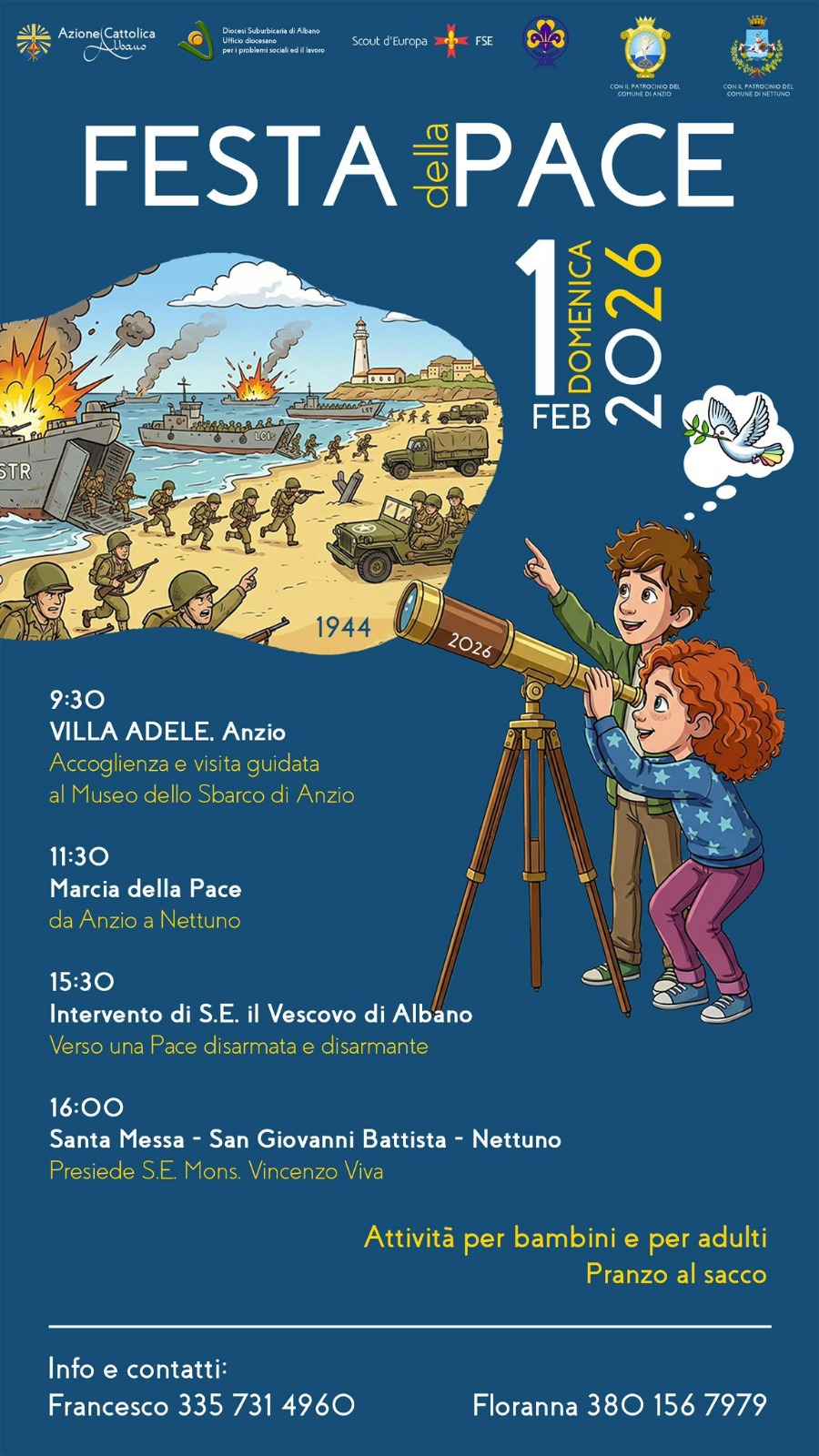 27/01/2026 – Si terrà domenica 1° febbraio, tra Anzio e Nettuno, l’edizione 2026 della “Festa della Pace”, a cura dell’Azione Cattolica della diocesi di Albano, in collaborazione con l’ufficio diocesano per i Problemi sociali e il lavoro, i gruppi Scout Agesci e Fse del territorio, e il patrocinio dei Comuni di Anzio e Nettuno.
