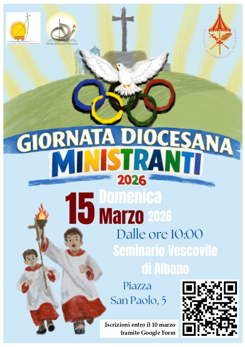 02/03/2026 – Si terrà domenica 15 marzo, dalle 10 presso il Seminario vescovile di Albano, la Giornata diocesana dei Ministranti, a cura del Centro diocesano per le vocazioni, diretto da don Gabriele D’Annibale e dal Servizio per la Pastorale giovanile, diretto da don Valerio Messina, quale opportunità per riscoprire il senso ultimo del servizio liturgico e per creare nuove amicizie.
