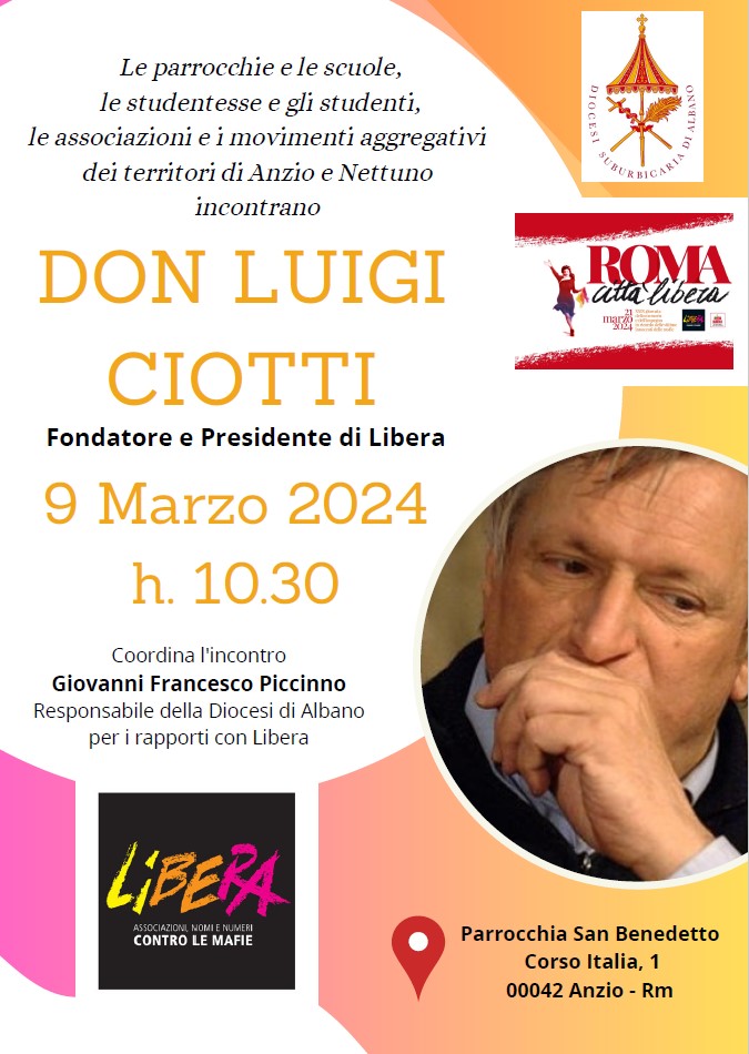 28/02/2024 – Sabato 9 marzo, alle 10,30 nei locali della parrocchia di San Benedetto, in corso Italia, 10 ad Anzio, don Luigi Ciotti, fondatore e presidente dell’associazione Libera, incontrerà le parrocchie, le scuole, le studentesse e gli studenti, le associazioni e i movimenti aggregativi dei territori di Anzio e Nettuno. L’incontro, che sarà moderato da Giovanni Francesco Piccinno, responsabile della diocesi di Albano per i rapporti con Libera, sarà in preparazione alla celebrazione della Giornata della memoria e dell’Impegno in ricordo delle vittime innocenti delle mafie, il prossimo 21 marzo a Roma, al Circo Massimo (clicca qui).