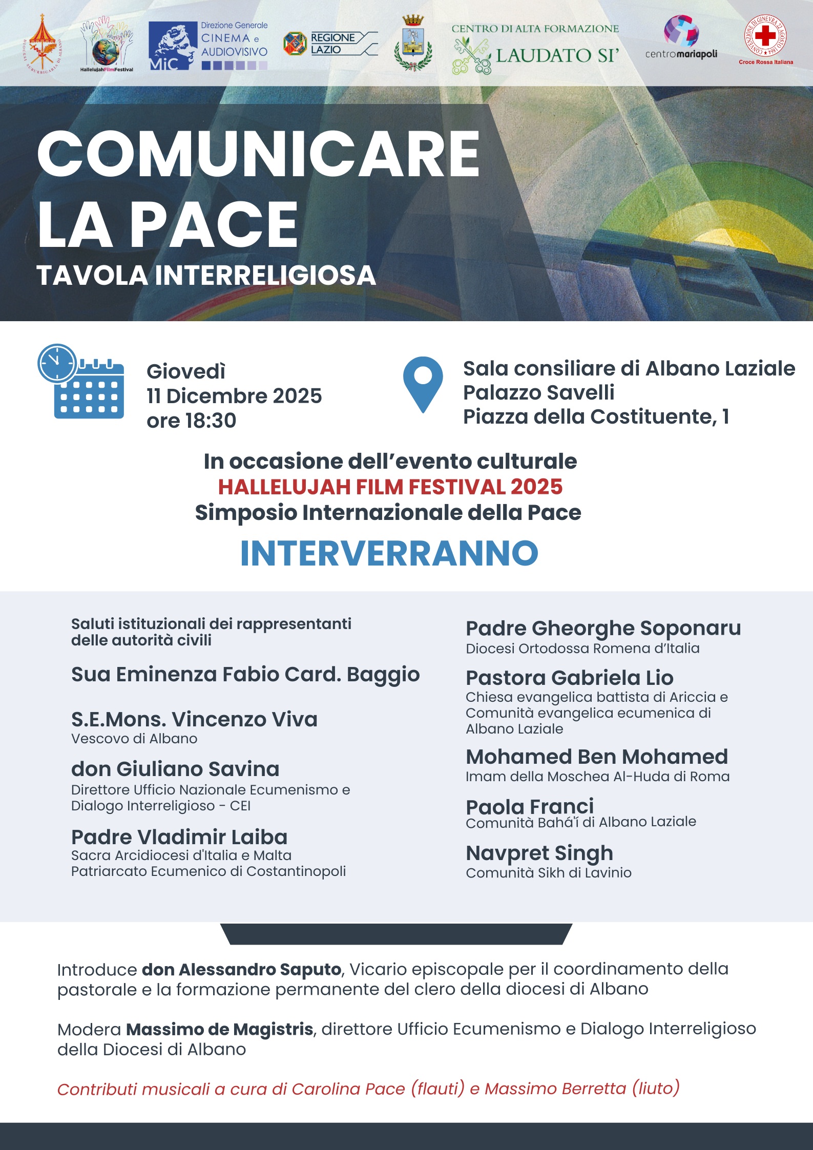 Tra i relatori dell’evento, oltre a quelli citati, ci saranno anche padre Vladimir Laiba, della Sacra Arcidiocesi d’Italia e Malta – Patriarcato Ecumenico di Costantinopoli, padre Gheorghe Soponaru, della parrocchia ortodossa Rumena “S. Venerabile Grande Martire Anastasia Romana” di Genzano di Roma, la pastora Gabriela Lio, della Chiesa evangelica battista di Ariccia e della comunità evangelica ecumenica di Albano, Mohamed Ben Mohamed, Imam della Moschea Al-Huda di Roma e presidente dell’Associazione culturale islamica in Italia, Paola Franci, della Comunità bahá’í di Albano Laziale e Navpret Singh, della comunità Sikh di Lavinio. Introdurrà l’incontro, moderato dallo stesso Massimo De Magistris, don Alessandro Saputo, vicario episcopale per il coordinamento della pastorale e la formazione permanente del clero della diocesi di Albano. Gli interventi saranno accompagnati dalle musiche di Carolina Pace (flauti) e di Massimo Berretta (liuto). L’’Hallelujah Film Festival è una manifestazione culturale che si svolgerà dal 6 al 13 dicembre a Castel Gandolfo e che prevede una rassegna di film, eventi e premiazioni alla presenza di personaggi dello spettacolo di caratura mondiale come la cantante israeliana Noa, i registi Matteo Garrone, Marco Pontecorvo e Liliana Cavani, l’attrice Cristiana Capotondi, il musicista Andrea Morricone e tanti altri.