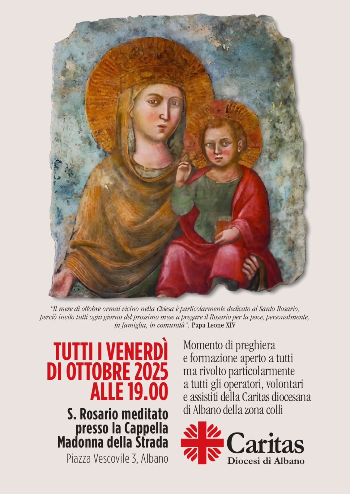 07/10/2025 – Accogliendo l’invito di papa Leone XIV, che ha invitato tutti i fedeli a invocare, attraverso la preghiera del Rosario, la pace, personalmente, in famiglia o in comunità, la Caritas della diocesi di Albano invita alla preghiera del Rosario, tutti i venerdì di ottobre alle 19, presso la Cappella dedicata alla Madonna della Strada, in piazza Vescovile, 3 ad Albano laziale.