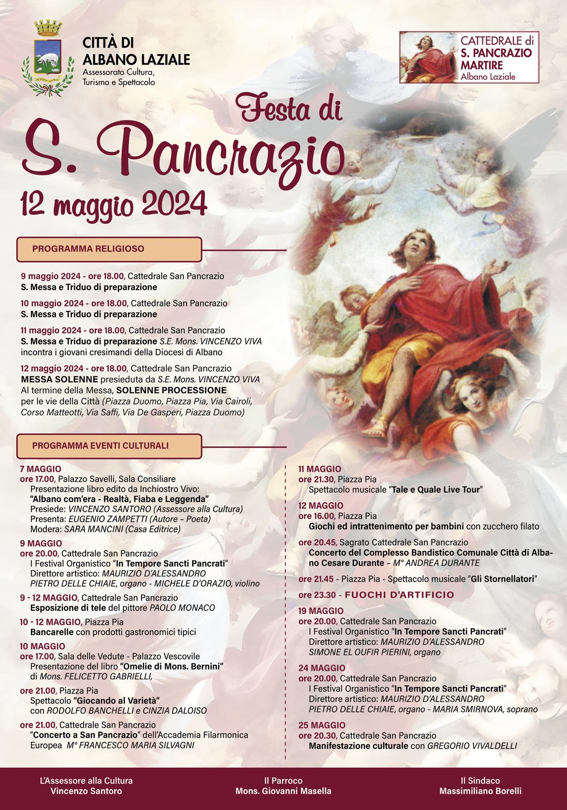 07/05/2024 – La diocesi di Albano e la città di Albano laziale si preparano a celebrare il loro santo patrono, San Pancrazio, con un calendario di eventi dal 7 al 25 maggio. Le celebrazioni religiose inizieranno in Cattedrale giovedì prossimo, con la Messa alle 18 e il triduo di preparazione, che proseguirà con lo stesso orario anche venerdì. Sabato 11 maggio, la Messa in San Pancrazio, con i cresimandi della diocesi, sarà celebrata dal vescovo Viva alle 18, come anche la Messa di domenica – festività di San Pancrazio – cui seguirà la processione con le reliquie del Santo. Il programma di eventi culturali inizierà martedì prossimo con la presentazione del libro “Albano com’era -realtà, fiaba e leggenda” di Eugenio Zampetti, alle 17 a Palazzo Savelli, e proseguirà con i concerti del festival organistico “In tempore Sancti Pancrati” e del festival diocesano di musica sacra, mostre pittoriche, presentazione di libri, giochi e spettacoli in piazza.