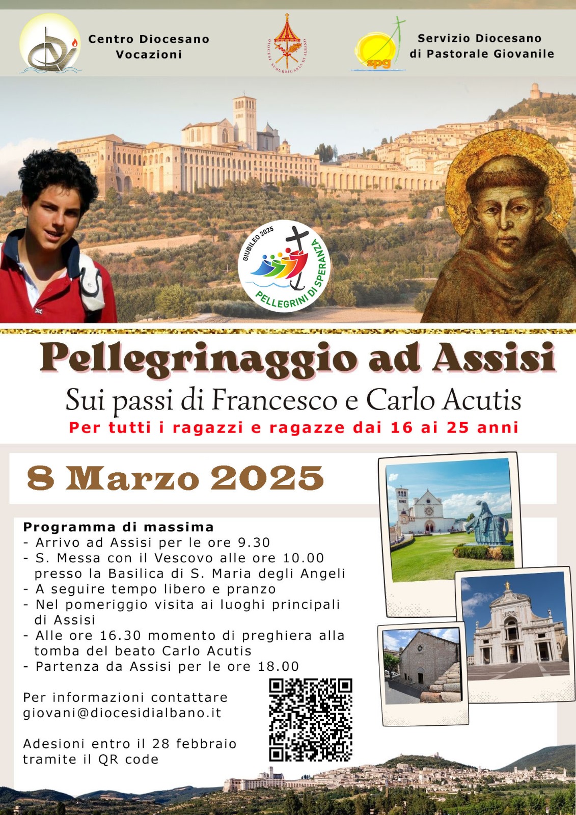 03/03/2025 – Sui passi di San Francesco e del beato Carlo Acutis, è in programma sabato 8 marzo il pellegrinaggio dei giovani della diocesi di Albano ad Assisi, a cura del Servizio diocesano di Pastorale giovanile, diretto da don Valerio Messina e del Centro diocesano per le vocazioni, diretto da don Gabriele D’Annibale. L’appuntamento è per le 9,30 ad Assisi e alle 10 i pellegrini – ragazze e ragazzi dai 16 ai 25 anni – parteciperanno alla celebrazione eucaristica presieduta dal vescovo di Albano, Vincenzo Viva, nella basilica di Santa Maria degli Angeli, mentre nel pomeriggio, dopo la visita ai principali luoghi della città di Assisi, si recheranno presso la tomba del beato Carlo Acutis, nella medesima basilica, per un momento di preghiera.