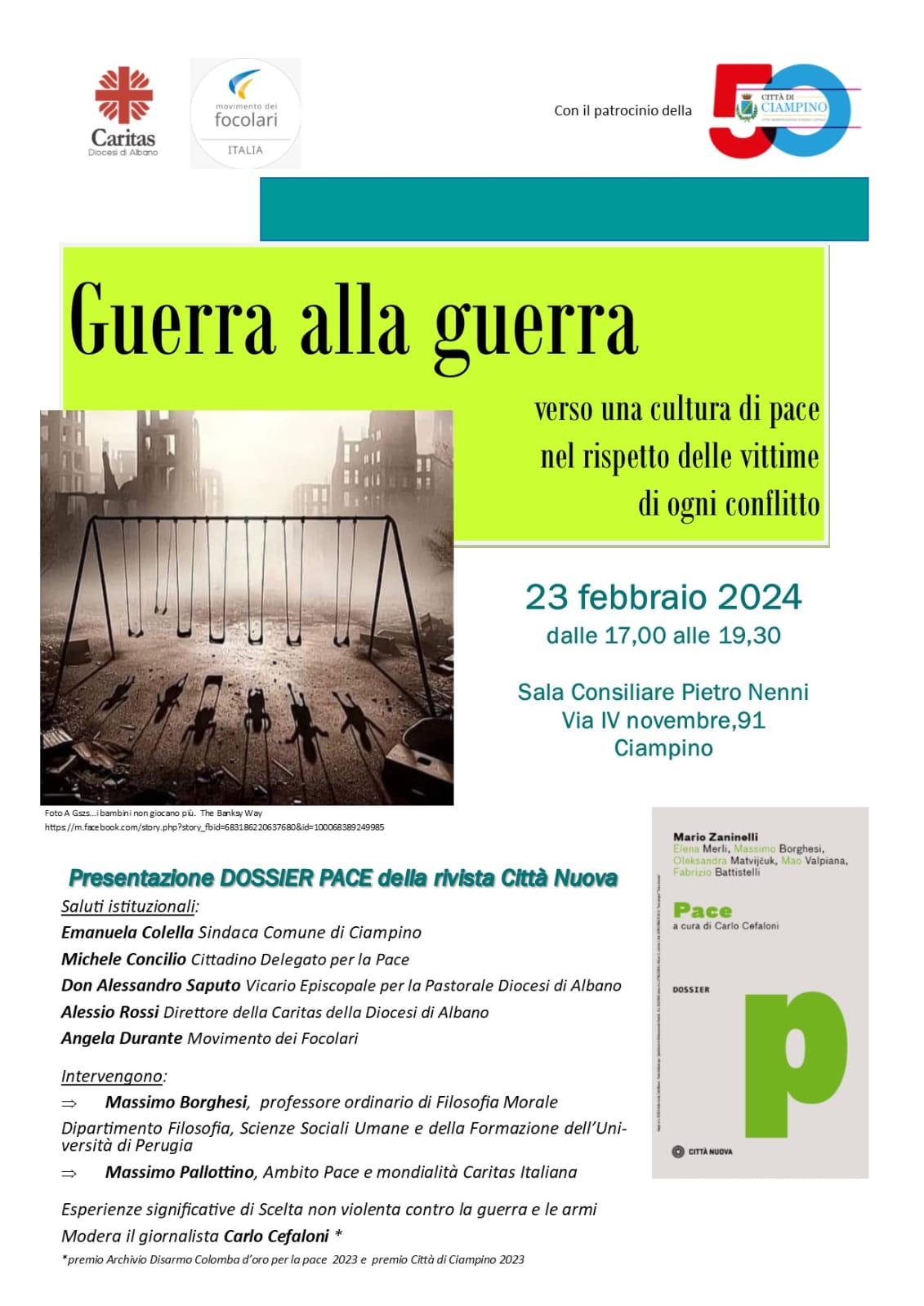 13/02/2024 – Si terrà venerdì 23 febbraio alle 17, presso la sala consiliare “Pietro Nenni” a Ciampino, un incontro per parlare di pace, alla vigilia del secondo anniversario dello scoppio della guerra in Ucraina, organizzato dalla Caritas della diocesi di Albano in collaborazione con “Città Nuova” e il movimento dei Focolari. L’evento, un momento di riflessione e dialogo, con la presentazione del “Dossier Pace” della rivista Città Nuova, curato dal giornalista Carlo Cefaloni, verterà sul tema “Guerra alla guerra. Verso una cultura di pace nel rispetto delle vittime di ogni conflitto”.