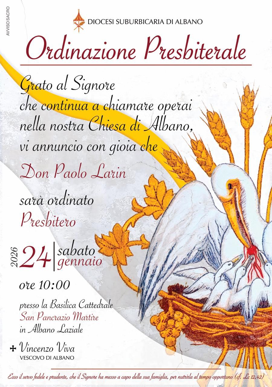 13/01/2026 – Sabato 24 gennaio, memoria liturgica di San Francesco di Sales, nella Messa delle 10 nella Cattedrale di San Pancrazio martire, ad Albano laziale, il diacono don Paolo Larin sarà ordinato presbitero, per le mani del vescovo Vincenzo Viva.