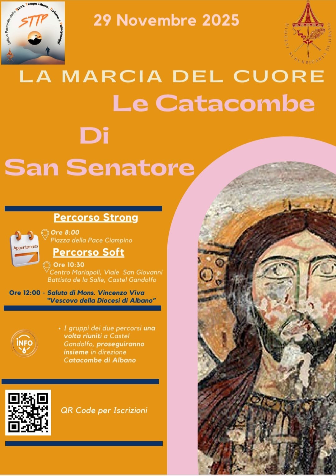 16/11/2025 – Si terrà nella mattinata di sabato 29 novembre, ad Albano laziale, la prima “Marcia del cuore”, un cammino a cura dell’ufficio per la Pastorale dello Sport, turismo e tempo libero della diocesi di Albano, diretto da don Antonio Salimbeni, che si concluderà alle Catacombe di San Senatore, cuore della cristianità sul territorio diocesano.