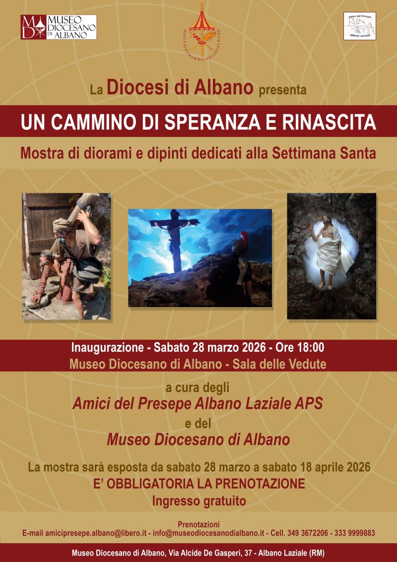 27/03/2026 – Sarà inaugurata sabato 28 marzo alle 18, nelle sale del Museo Diocesano di Albano e nell’ambito delle attività culturali dello stesso museo, la mostra di diorami e dipinti, dedicati alla Settimana Santa, dal titolo “Un cammino di speranza e rinascita”, a cura dell’associazione “Amici del Presepe Albano Laziale Aps”.