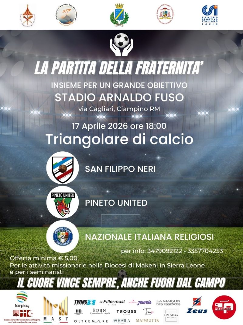 13/04/2026 – A cura dell’ufficio diocesano per la Pastorale dello sport, tempo libero, turismo e pellegrinaggi, si svolgerà venerdì 17 aprile, dalle 18 presso lo stadio “Arnaldo Fuso” di Ciampino, la “Partita della Fraternità”, con il patrocinio del Comune di Ciampino e del Centro Sportivo Italiano (C.S.I) – sezione del Lazio e alla presenza del vescovo Vincenzo Viva. «L’evento – dice don Antonio Salimbeni, direttore dell’ufficio diocesano – rappresenta un appuntamento nel quale lo sport si fa concreto veicolo di fratellanza ed accoglienza, punto di incontro di dialogo attraverso il linguaggio del gioco». In campo, si affronteranno, in un torneo triangolare, la Nazionale italiana Religiosi, la Pineto United, composta da richiedenti asilo, e la squadra del CSI della parrocchia di San Lorenzo a Pineta Sacchetti (Roma). «Tutte e tre realtà – aggiunge don Antonio Salimbeni – dove lo sport serve come strumento di formazione umana e relazionale di tipo integrale. Sarà effettuata una raccolta fondi, che verrà devoluta alle attività missionarie che la nostra diocesi porta avanti nella a Makeni, in Sierra Leone, e in un fondo per i seminaristi in difficoltà. Sarà un momento di grande intensità, dove lo sport è costruttore di relazioni solide, nel segno della carità che tutti abbraccia e accoglie».
