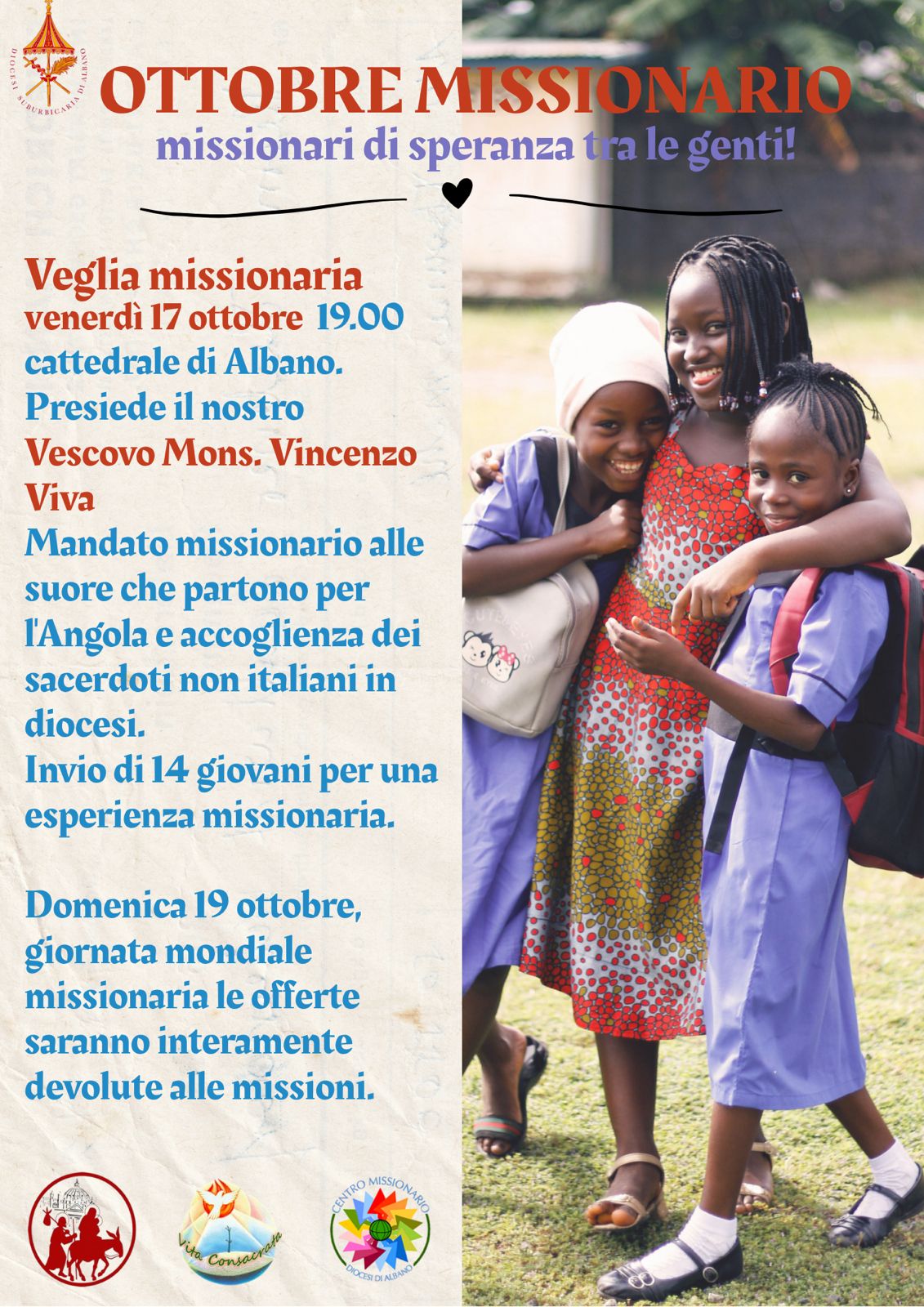 L’appuntamento, sul tema “Missionari di speranza tra le genti” – scelto da papa Francesco per la XCIX Giornata missionaria mondiale 2025 – è stato organizzato dal Centro missionario diocesano, diretto da monsignor Pietro Massari, dall’ufficio per la Pastorale dei migrantes della diocesi di Albano, diretto da don Fernando Lopez e dall’ufficio diocesano per la Vita consacrata, diretto da don Gian Franco Poli. Nel corso della celebrazione, presieduta dal vescovo Vincenzo Viva, sarà conferito il mandato missionario a un diacono e a due seminaristi che, insieme a 11 Giovani Costruttori per l’umanità, sono in procinto di partire per un’esperienza presso la missione di Makeni, in Sierra Leone, e a un gruppo di religiose, in partenza per l’Angola.